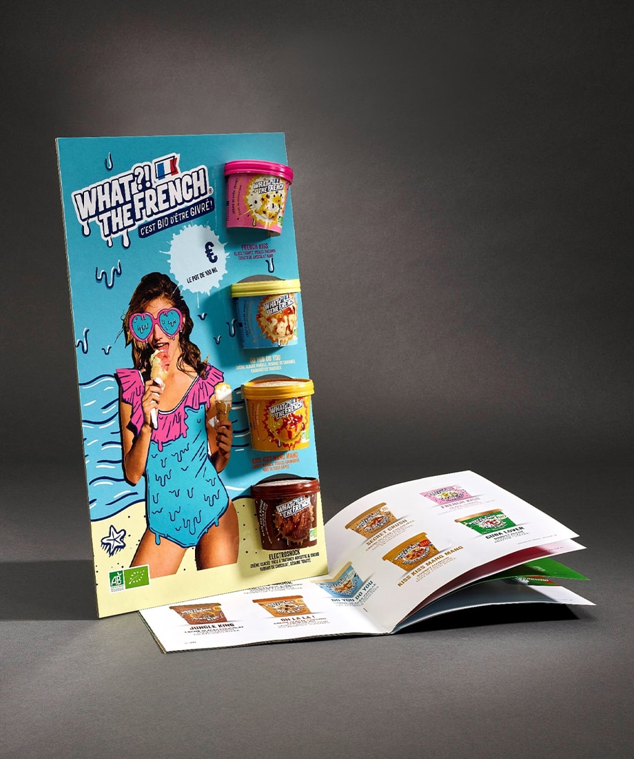 Un 3 volets pratique à étudier, illustré avec la gamme des glaces du moment, et les visuels de tous les packagings.